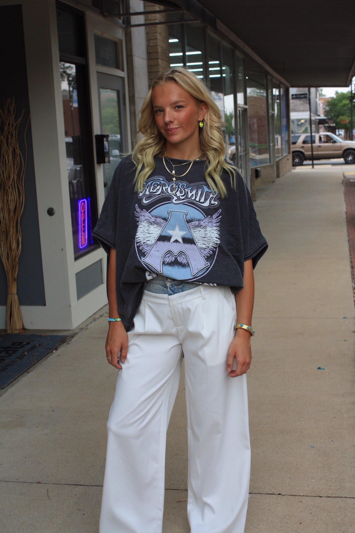 Relive the classic rock era with our Aerosmith Sweet Emotion One Size Sweatshirt. This unique top, in Black, is designed with artwork from their 1975 hit "Sweet Emotion." It features a wide off-the-shoulder neckline, short sleeves, a rounded high-low bottom hem, and ribbed edges, perfect for a relaxed, comfortable, and stylish look.