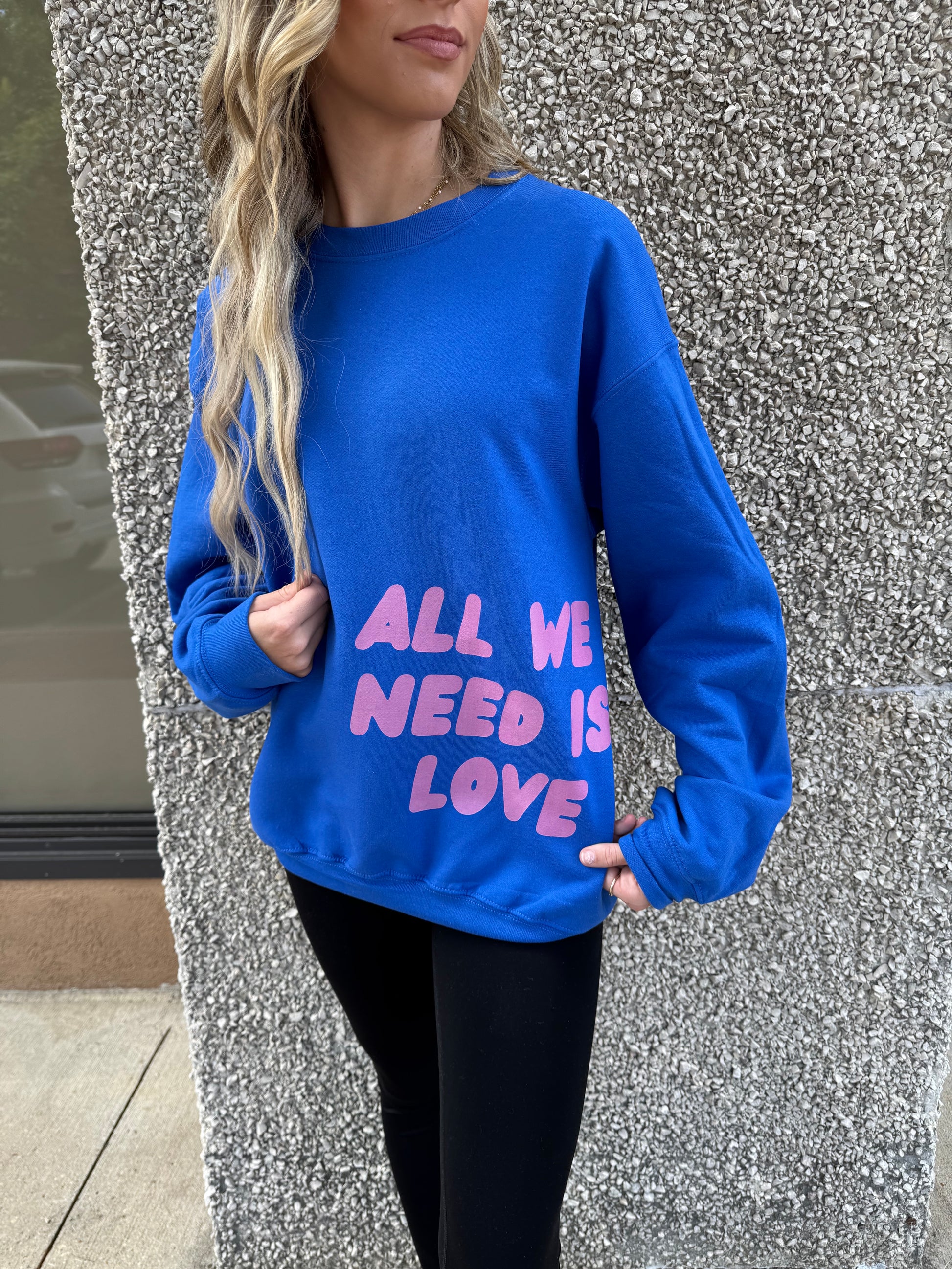 This blue sweatshirt features a soft, comfortable fabric and a bold pink graphic that reads "all we need is love." Its classic fit and eye-catching design make it a versatile piece for casual wear, expressing a timeless message with style and ease. Perfect for layering or wearing on its own, it combines comfort with meaningful fashion.