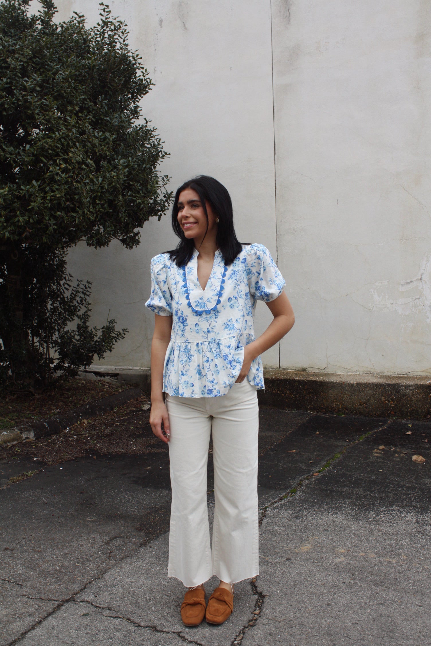 Floral-printed peplum top featuring bubble sleeves and a scallop-trimmed detailed front. Can be paired with CP10042. Model Size + Fit: Model height: 5'9" Dress size: Small Bust: 33 Waist: 25 Hips: 34