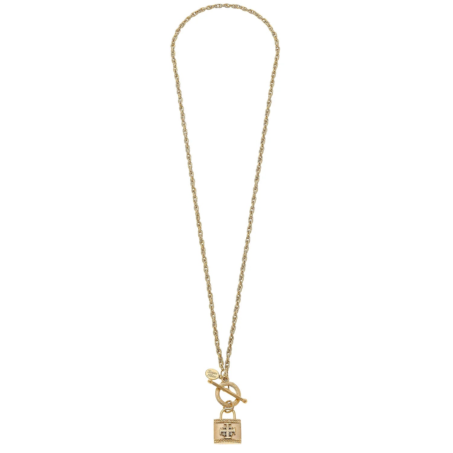 This Susan Shaw necklace features a playful take on the traditional Jerusalem cross with a unique lock toggle design, perfect for adding a touch of whimsy to any outfit. Handcrafted with care, it's a versatile addition to any jewelry collection.