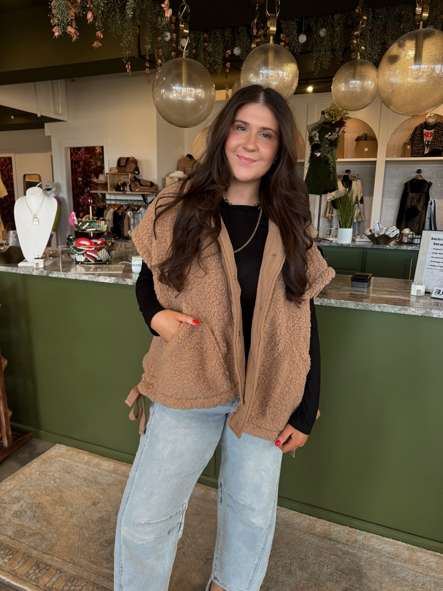 Stay cozy and cute in our Snap Button Teddy Vest! This warm fleece vest features cap sleeves, a collared neckline, and a unique snap button closure. With practical side pockets and a fun bottom tie, you'll be ready to brave the cold in style.